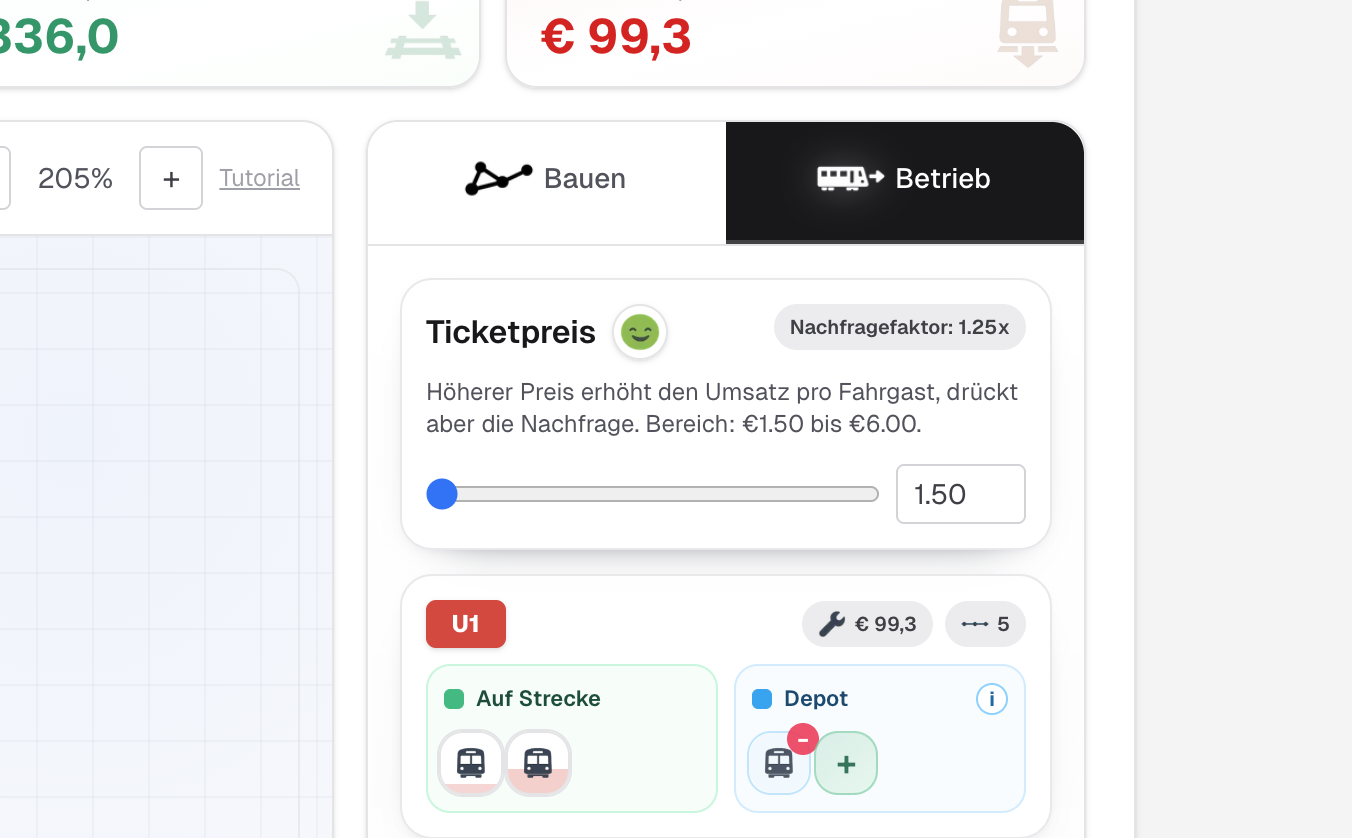 Hier regelst du den Ticketpreis (mehr Umsatz pro Person vs. weniger Nachfrage) und deinen Fuhrpark pro Linie. Züge kosten Geld (laufend!) – zu viele Züge fressen dich, zu wenige lassen Stationen überlaufen.